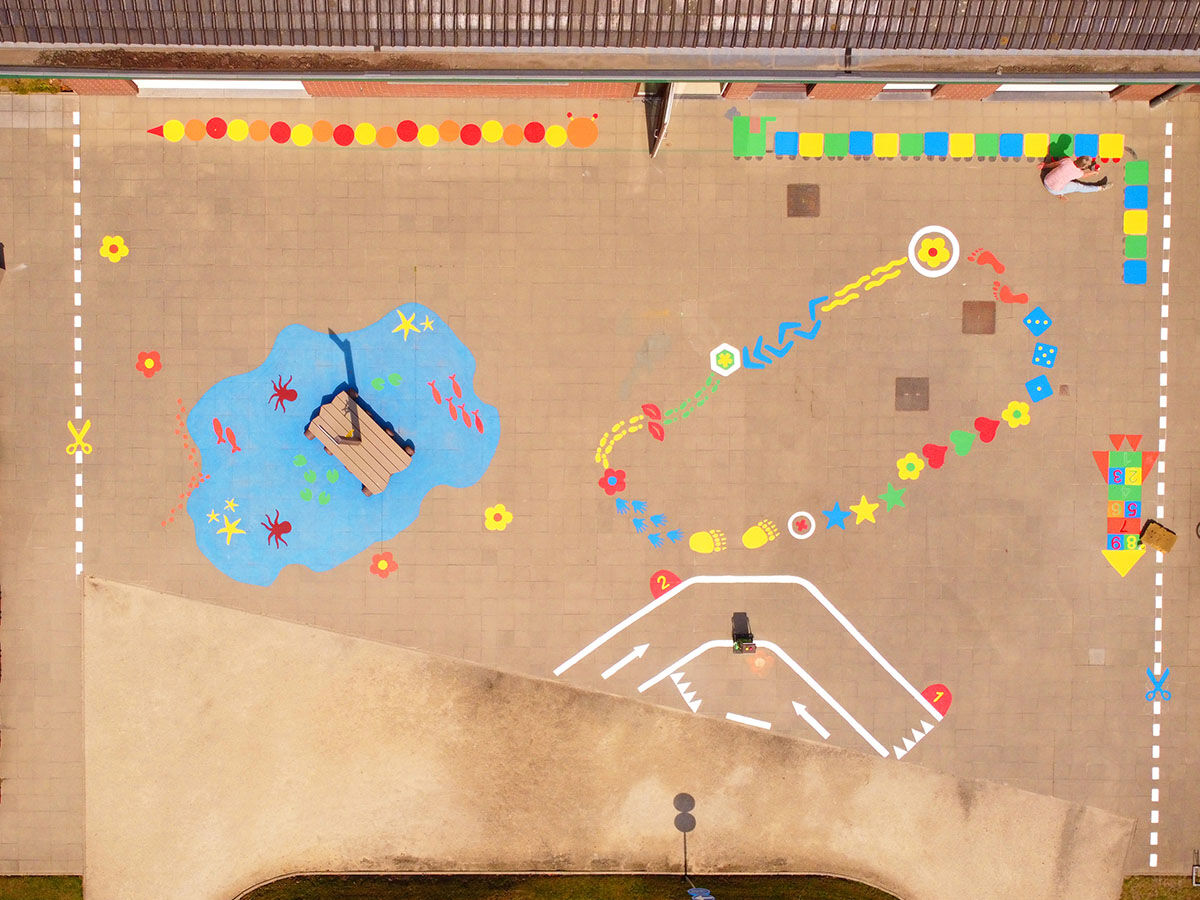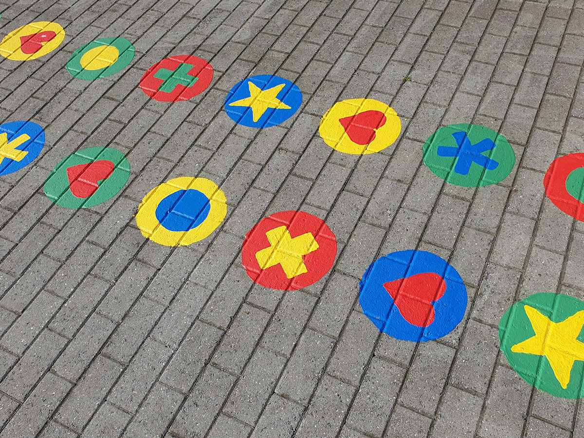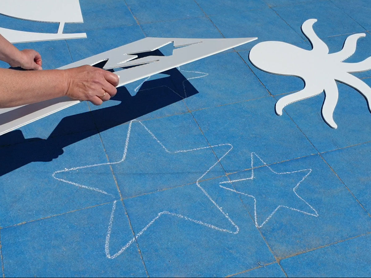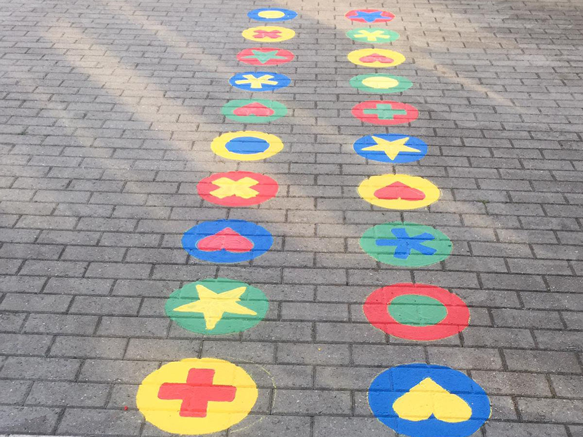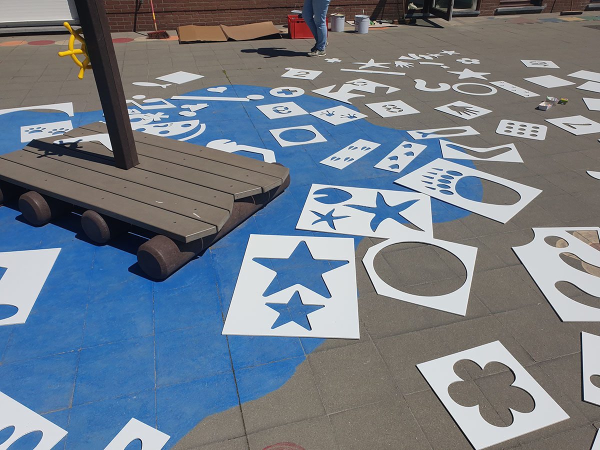 Met deze sjablonen zijn de mogelijkheden vrijwel onbegrensd. Duw de voorgesneden vormen uit de platen en teken af met een krijtje. Kleur daarna in met onze slijtvaste wegenverf. Met enkele vrijwilligers tover je de speelplaats snel & budgetvriendelijk om in een kleurrijk geheel!