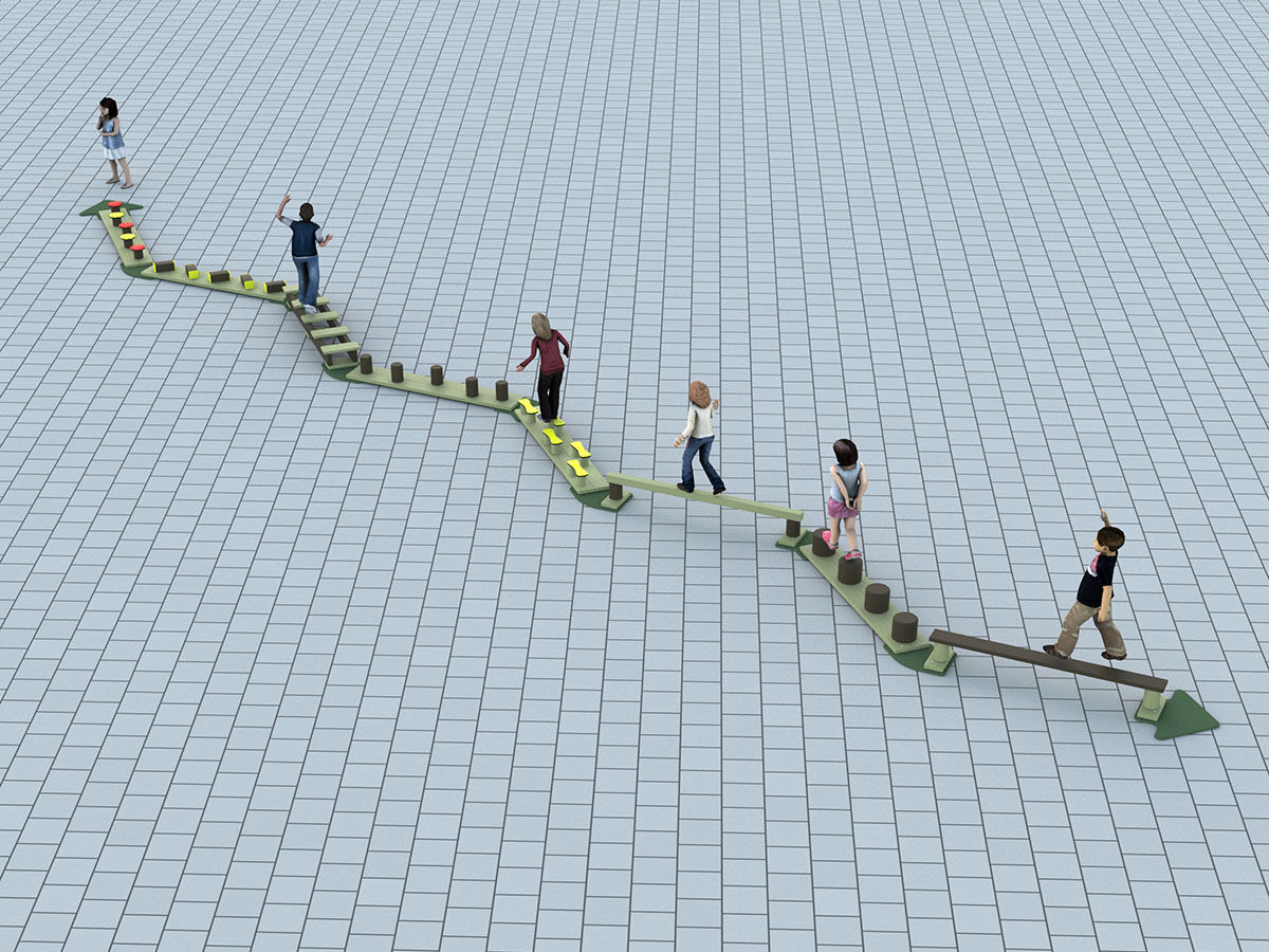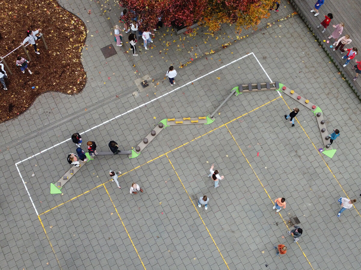 Maak een ontwerp en richt uw speelplaats in met het parcours opgesteld naar keuze: linieair opgesteld, in lusvorm opgesteld, etc..