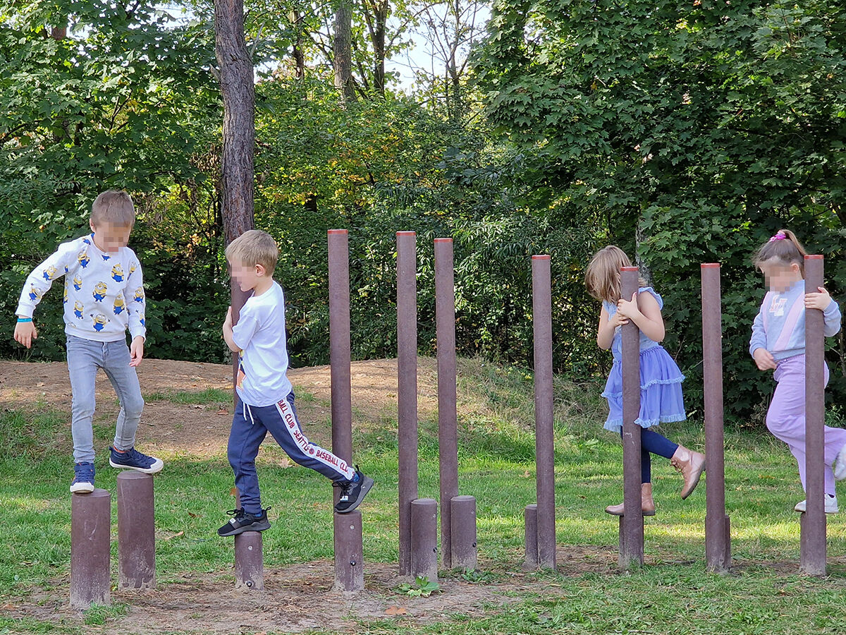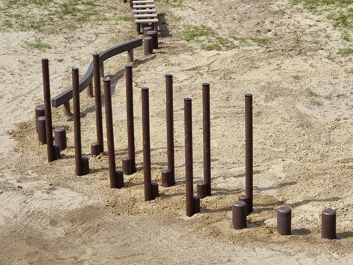 Deze set van 10 stelten, gemaakt uit onderhoudsvrije recycling kunststof, maakt deel uit van ons "hindernissenparcours GP101 voor gras- of bosgrond". Door de beige- en bruintinten past dit parcours perfect in een natuurlijke omgeving.