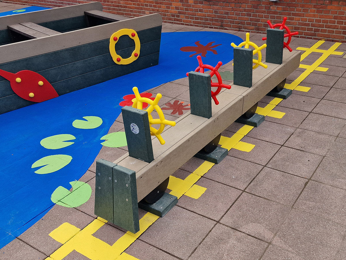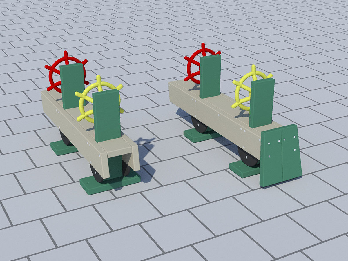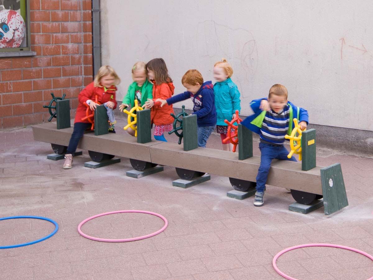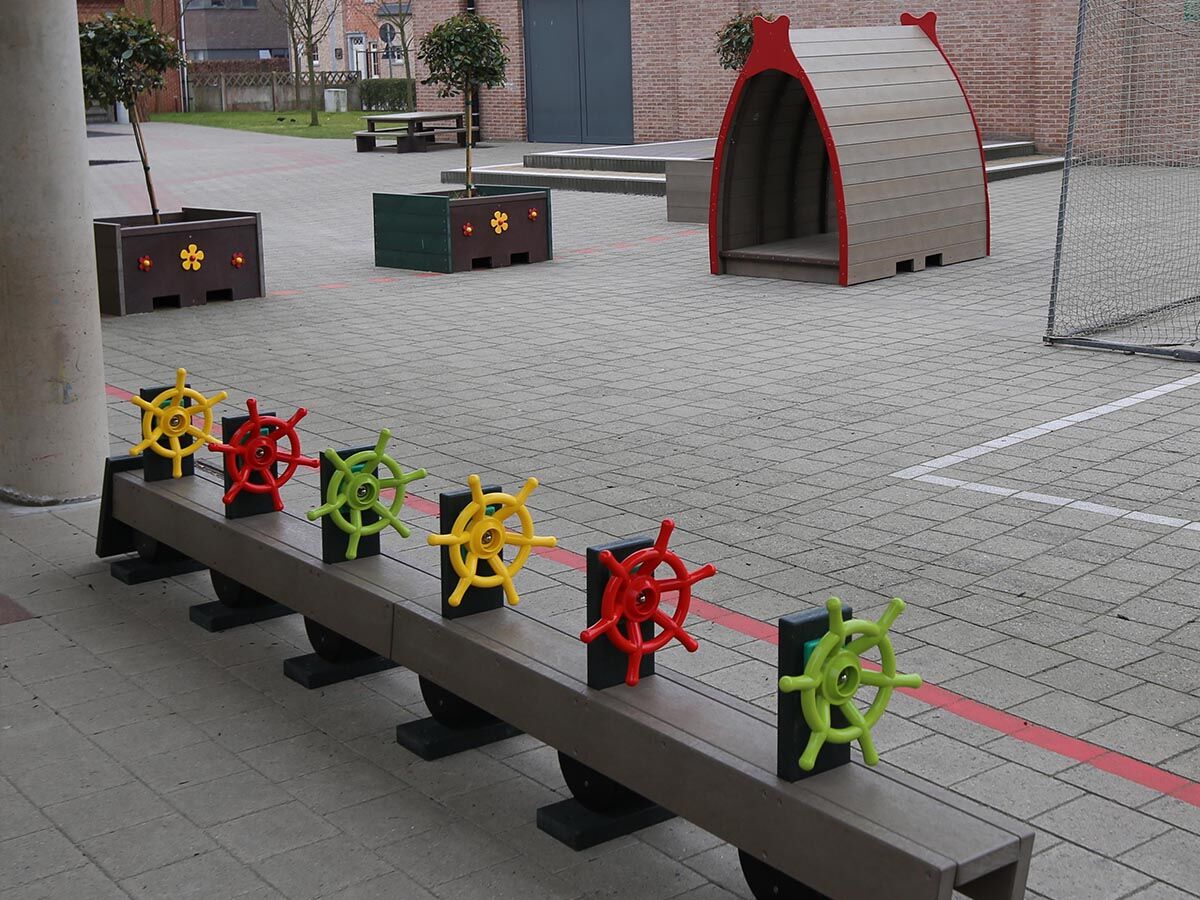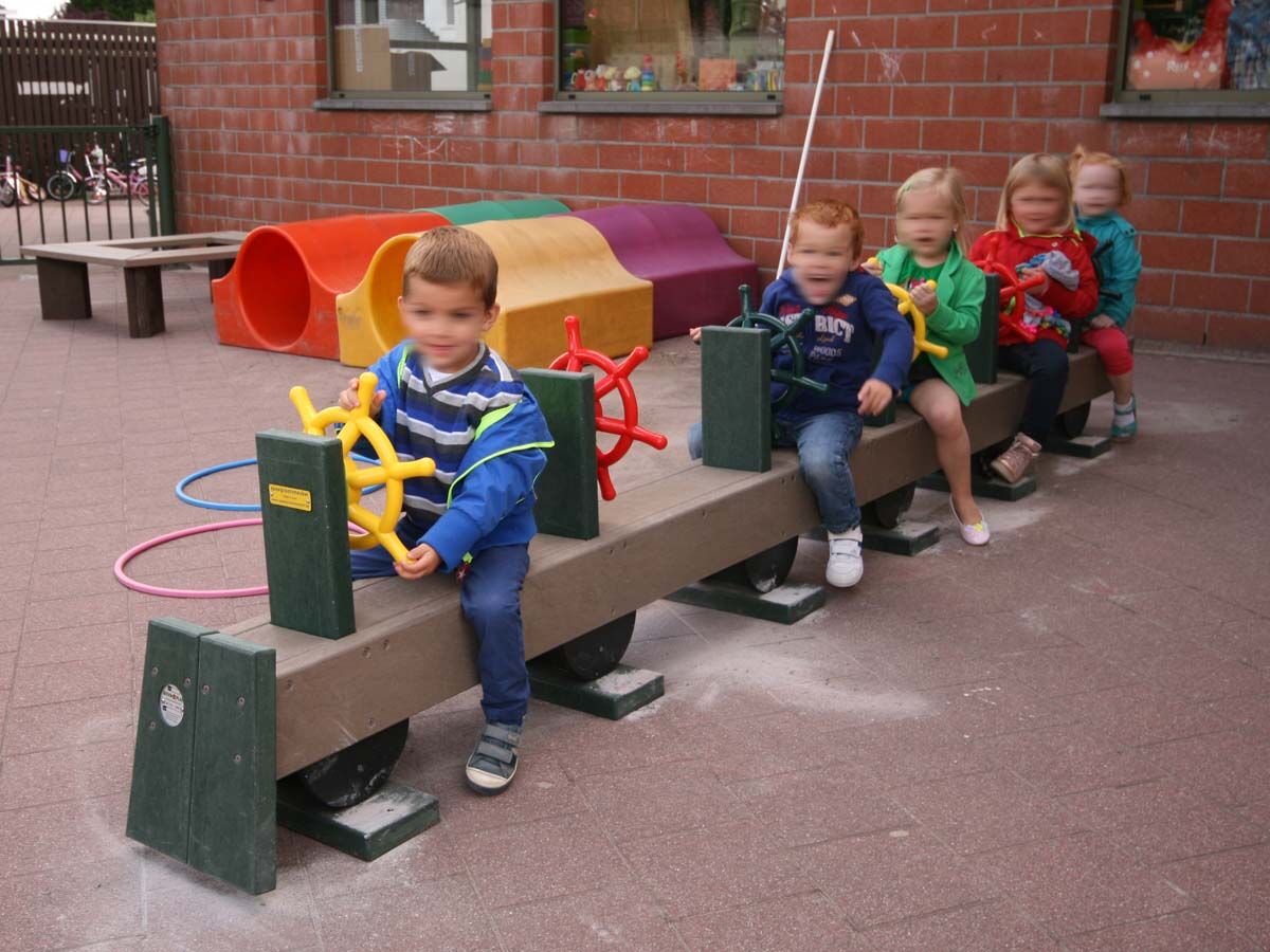 Een kleurrijk eenvoudig meerdelig “treintje” voor de kleuterspeelplaats, met roeren die echt draaien. Kan van alles voorstellen in de fantasie van de kleuters. U maakt de trein zo lang u wil!
