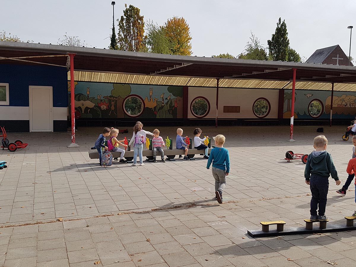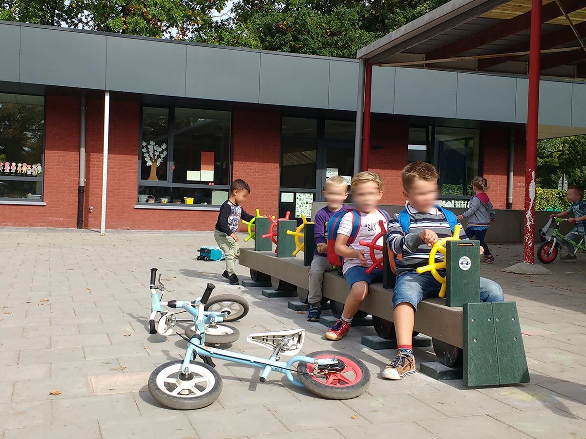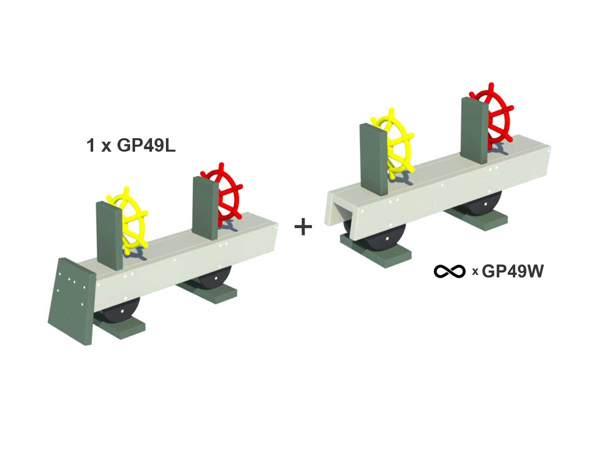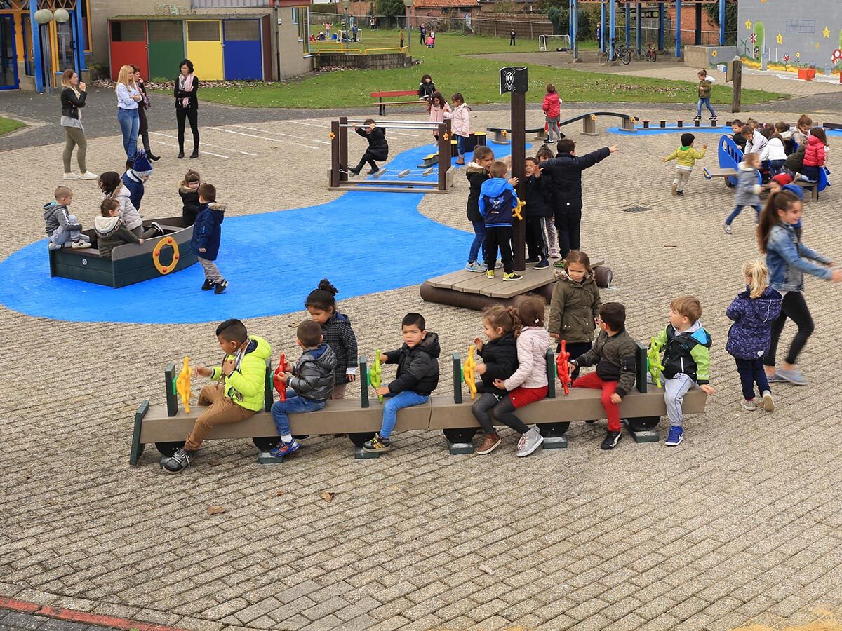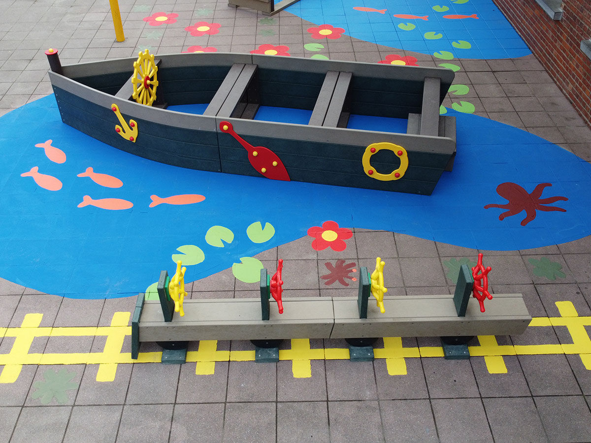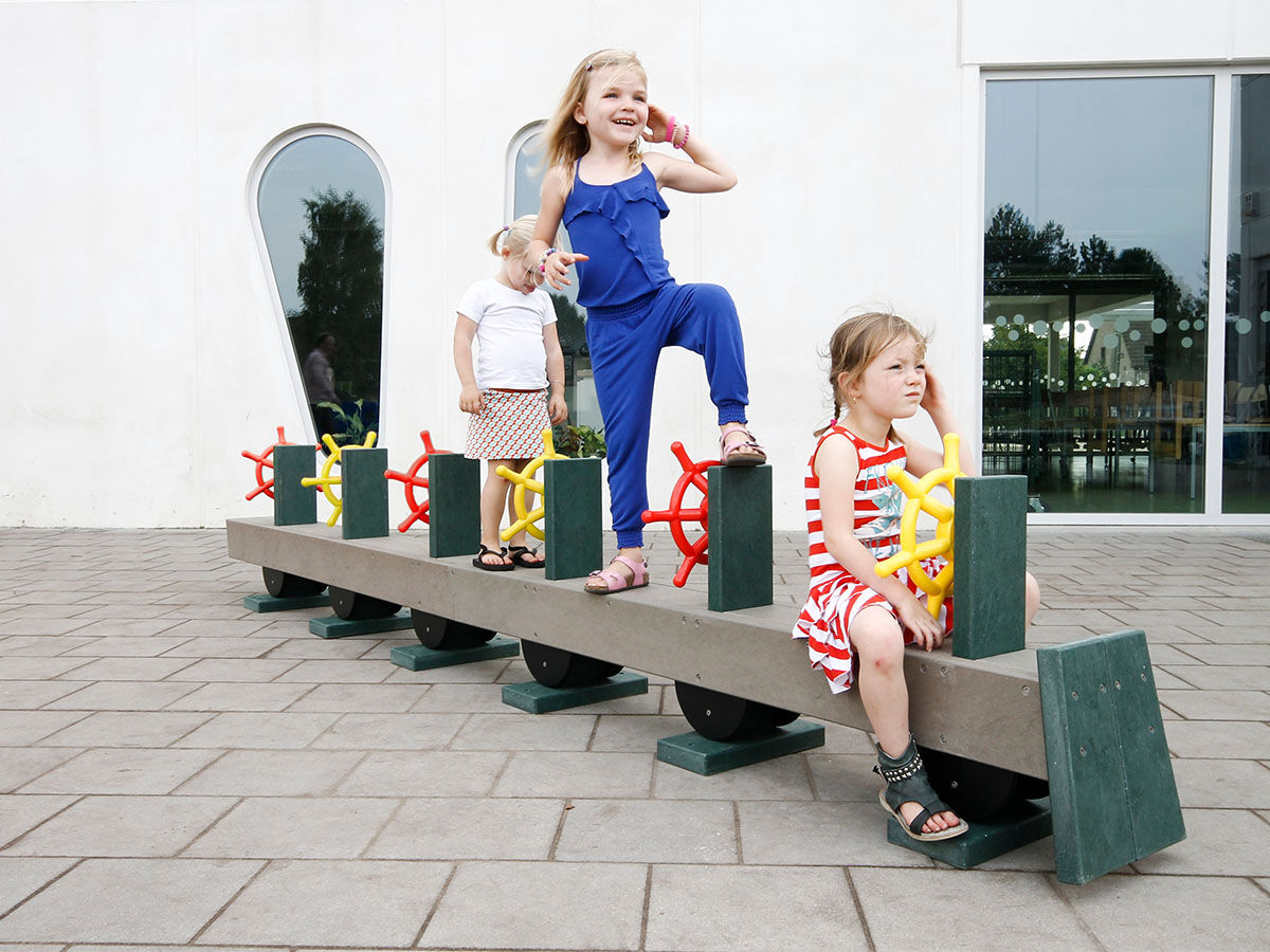 Een kleurrijk eenvoudig meerdelig “treintje” voor de kleuterspeelplaats, met roeren die echt draaien. Kan van alles voorstellen in de fantasie van de kleuters. U maakt de trein zo lang u wil!
