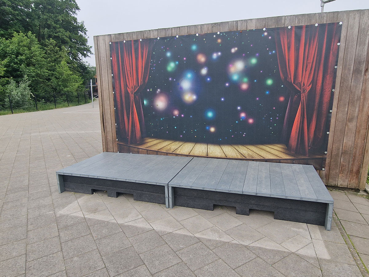 Deze oerdegelijke podia staan al meer dan 10 jaar op diverse speelplaatsen dankzij de 4 cm dikke planken. Bekijk ook onze podia met multicolour planken, beschikbaar in 3 hoogtes. Geschikt voor plaatsing op een vlakke ondergrond. Kunnen verplaatst worden met een transpallet.