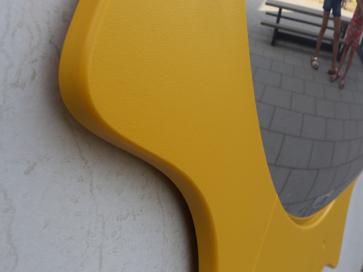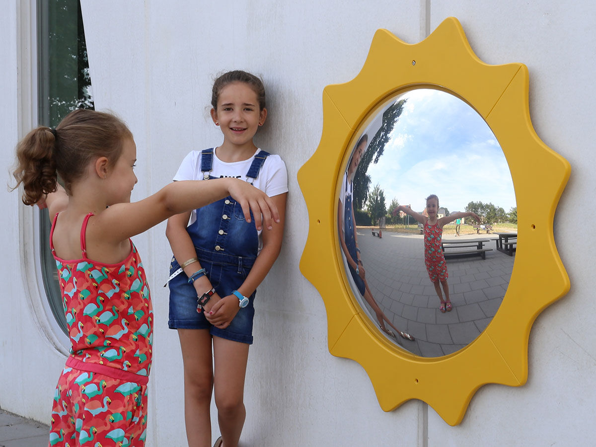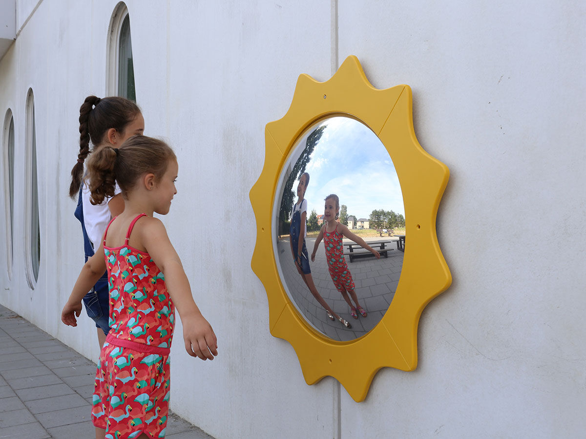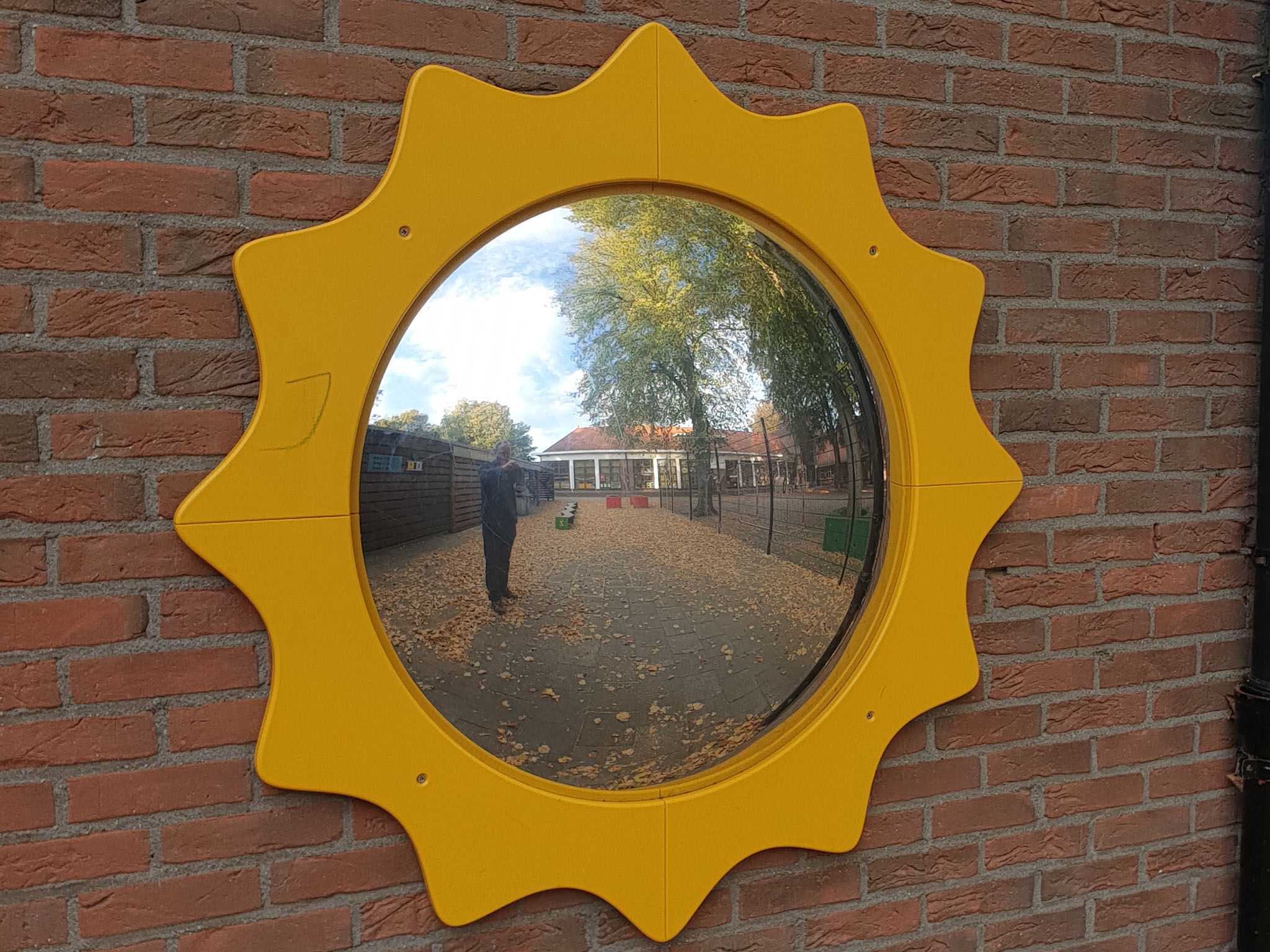 Stevige volledig bolle kunststof onbreekbare spiegel met gele zonvormige kader. Geleverd met 4 RVS nagelpluggen voor muurbevestiging.