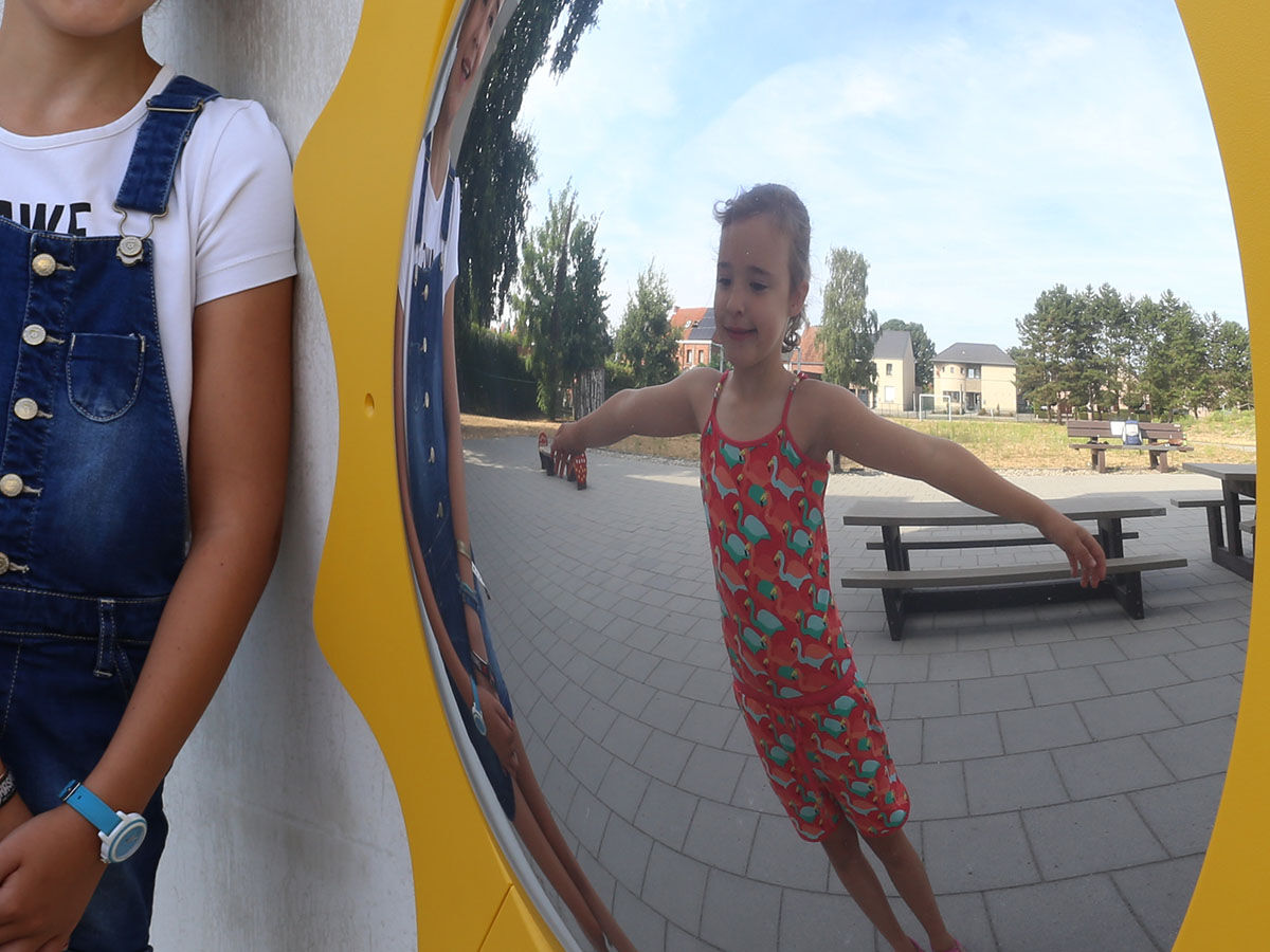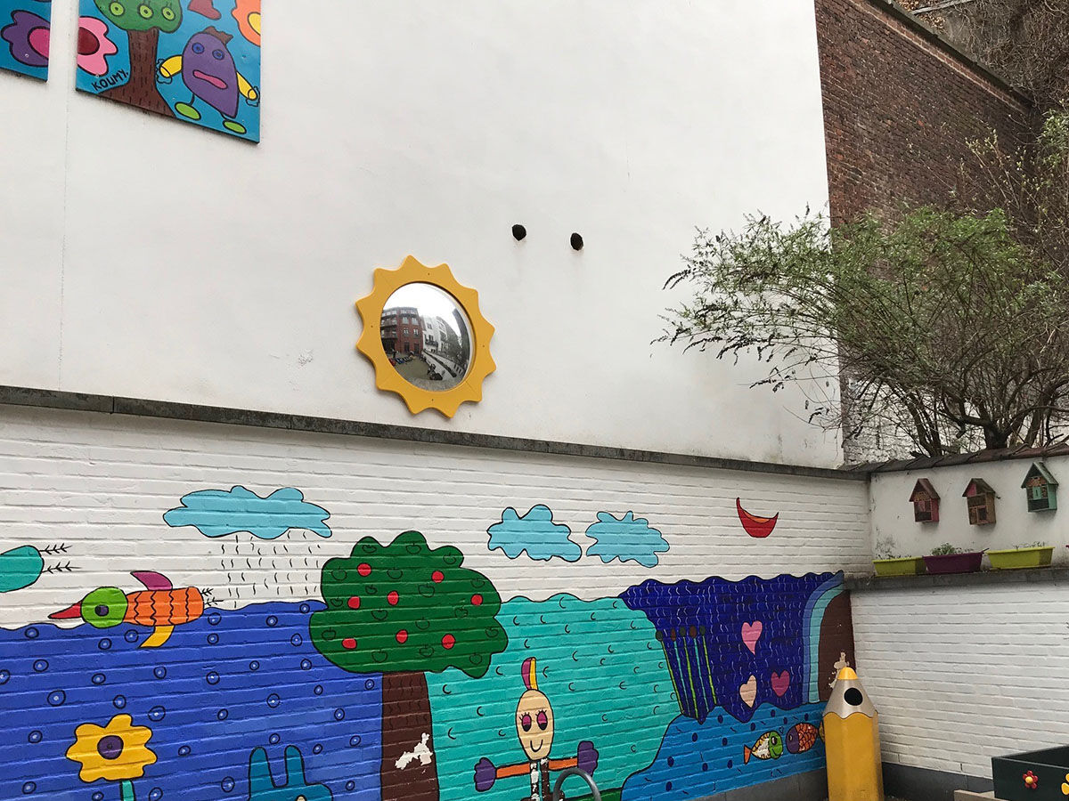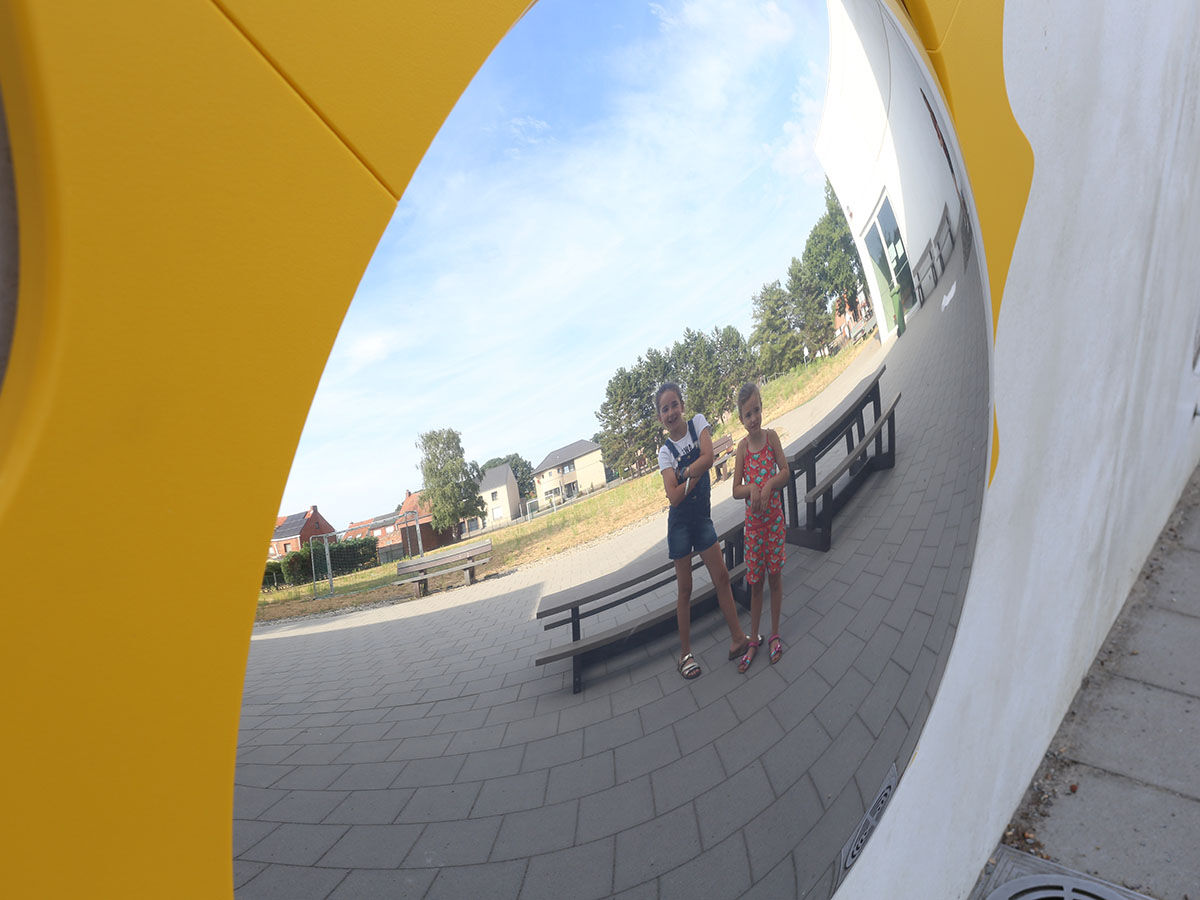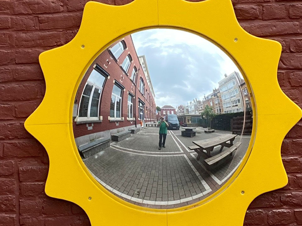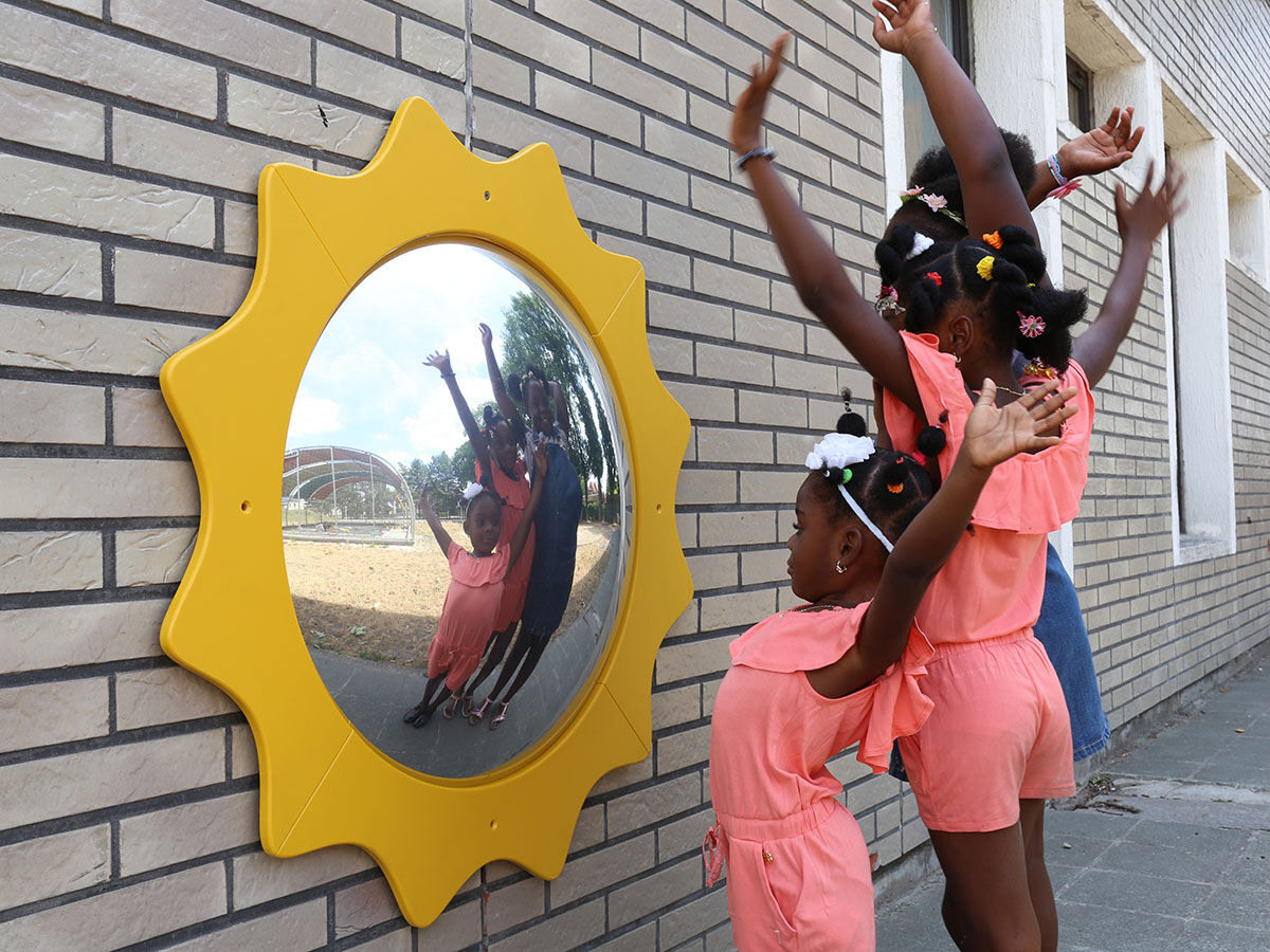 Stevige volledig bolle kunststof onbreekbare spiegel met gele zonvormige kader. Geleverd met 4 RVS nagelpluggen voor muurbevestiging.