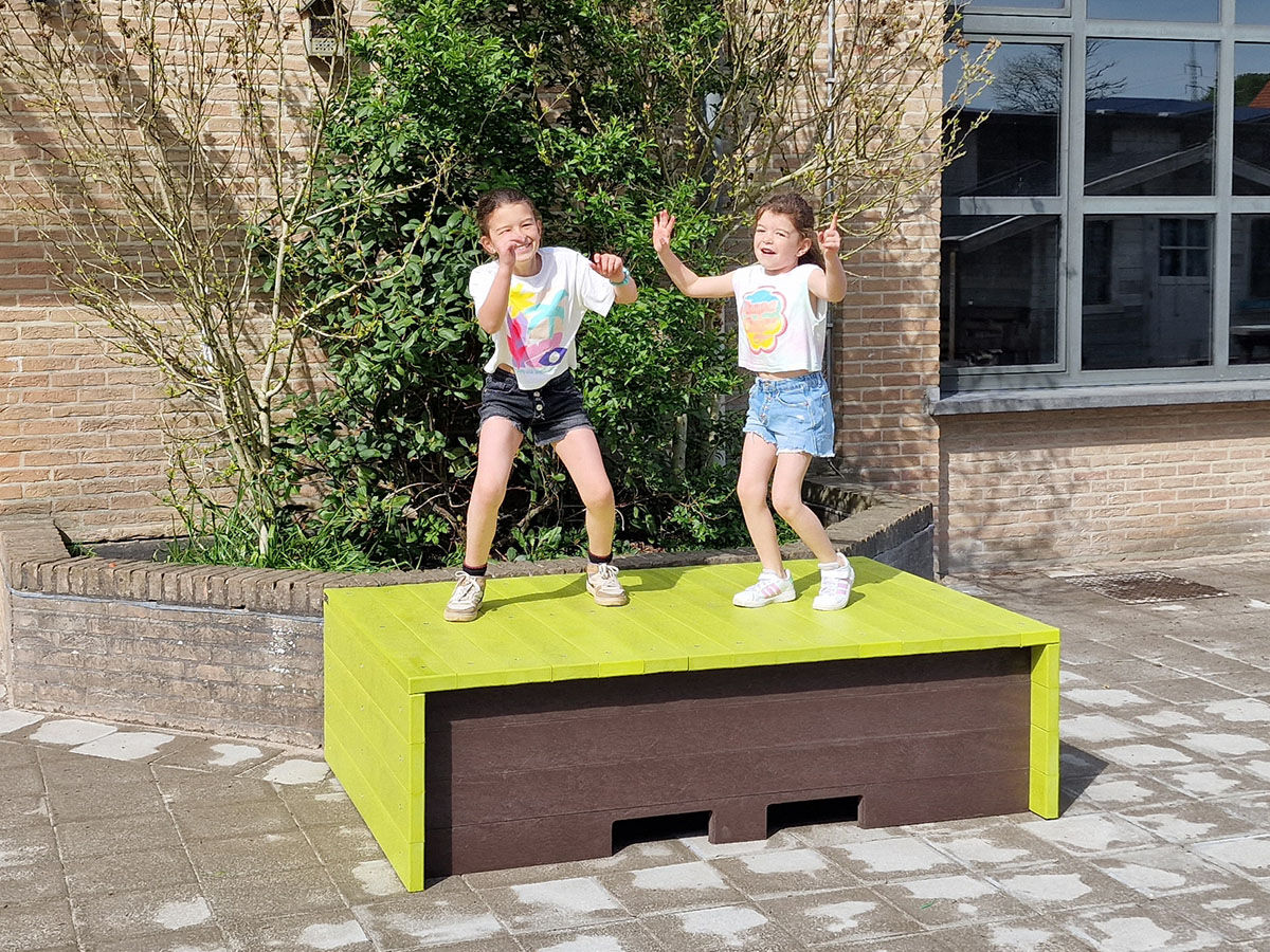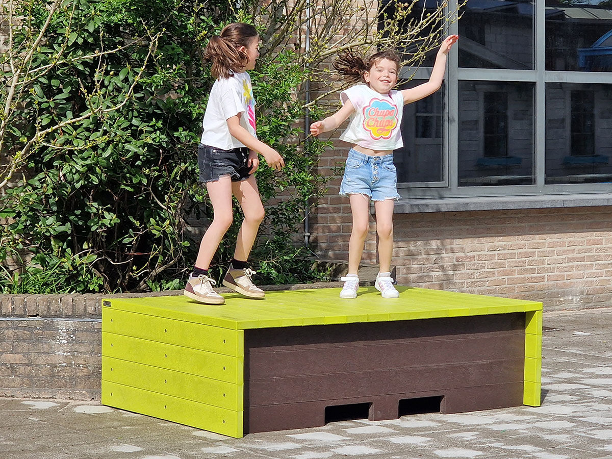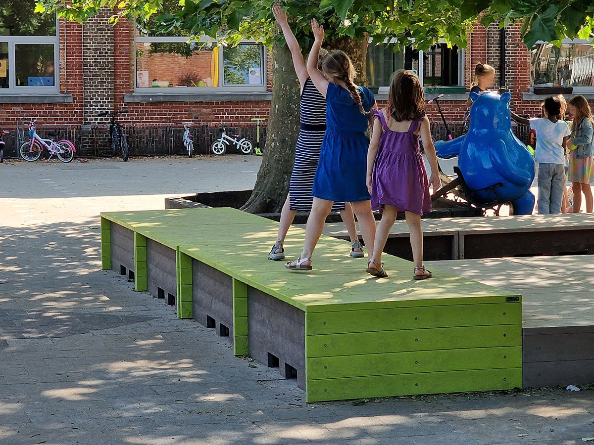 Dit podium is verplaatsbaar met een transpallet en hoeft niet verankerd te worden. Eigenlijk is het een variant van podium Star, maar dan met groene recycling (bebat-vaten ) planken uit van 12 cm breed i.p.v. van 15 cm breed.