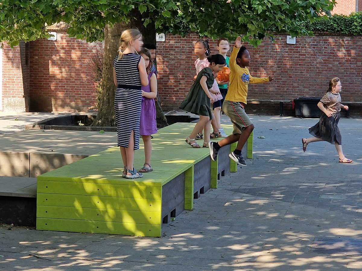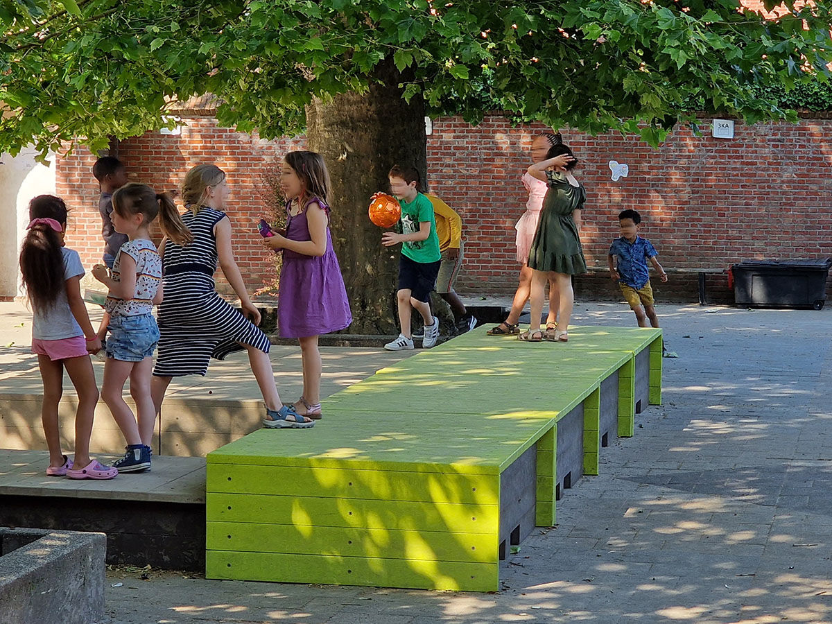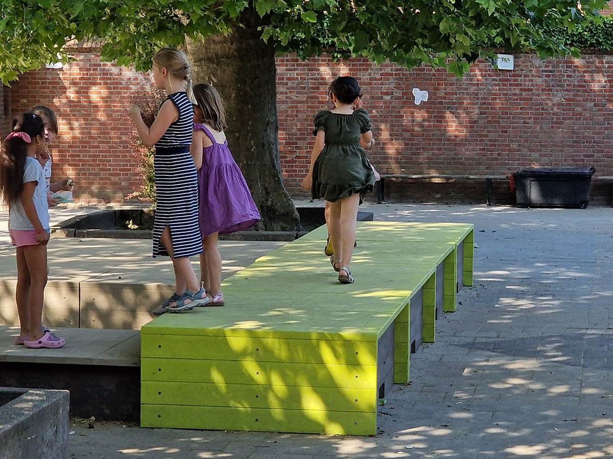 Dit podium is verplaatsbaar met een transpallet en hoeft niet verankerd te worden. Eigenlijk is het een variant van podium Star, maar dan met groene recycling (bebat-vaten ) planken uit van 12 cm breed i.p.v. van 15 cm breed.