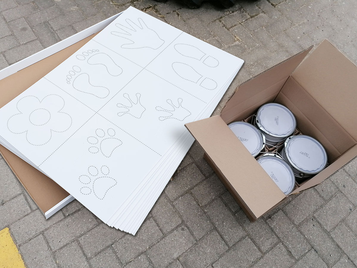 Pak sjablonen met 4 potten van 5 kg wegenverf (blauw, rood, geel, wit) + een doos van 10 stevige kunststof platen van 80 x 120 cm voorgesneden sjablonen.