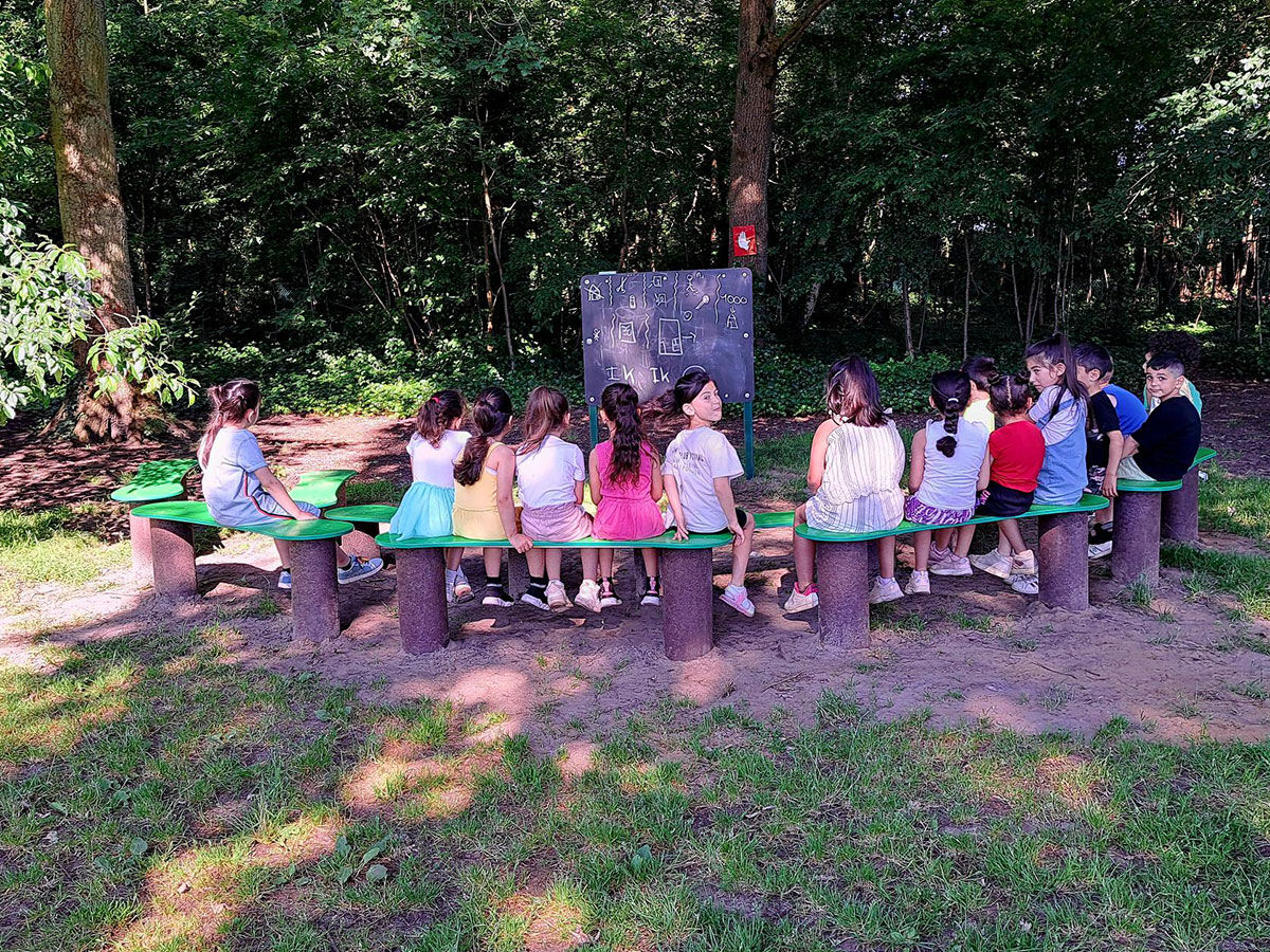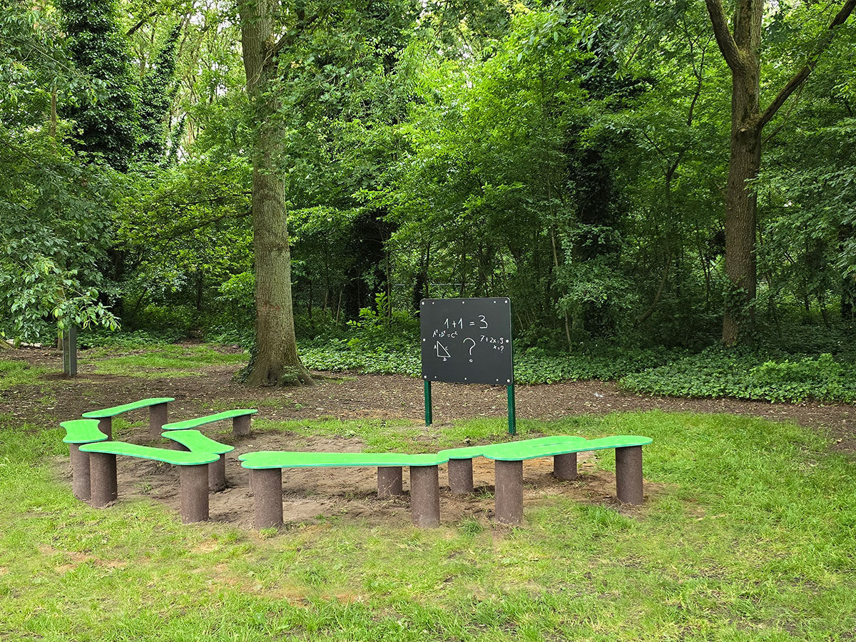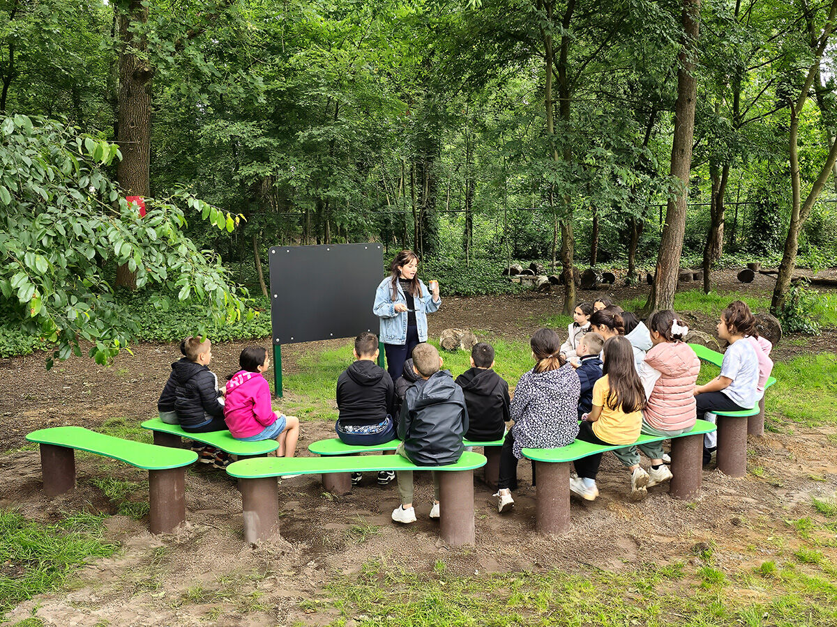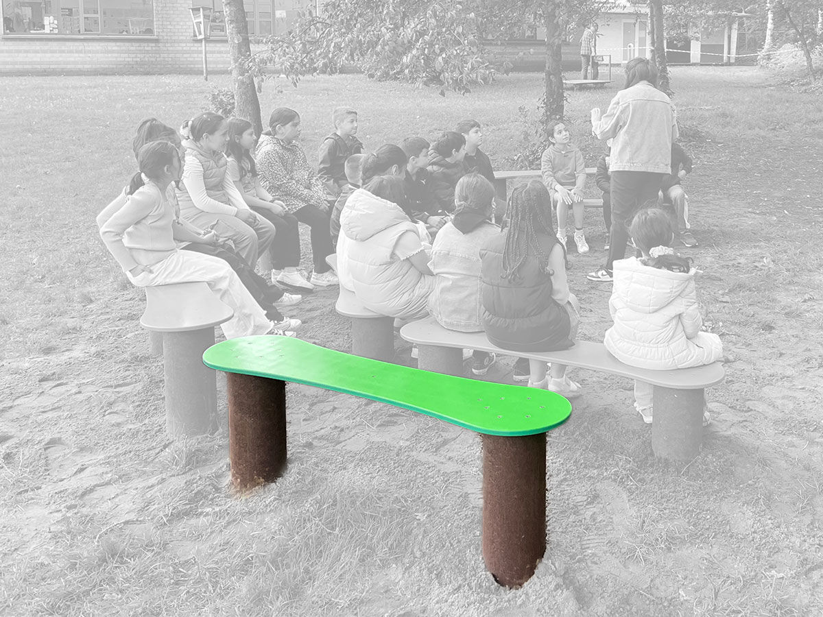 Leuk modulair bankje uit UV-bestendige PE-plaat, om in te graven. Op één bankje kunnen 3 volwassenen, 4 lagere-schoolkinderen of 5 kleuters plaatsnemen.