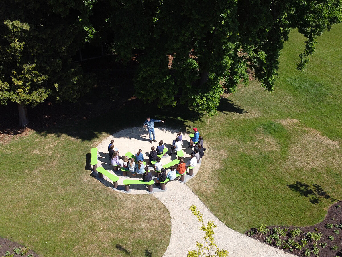 De bankjes kunnen geplaatst worden in een vorm naar wens: als buitenarena in een (halve) cirkel, in een rechte rij, schuin, ... Aluminium verstevigingsprofielen onder de zitvlakken.