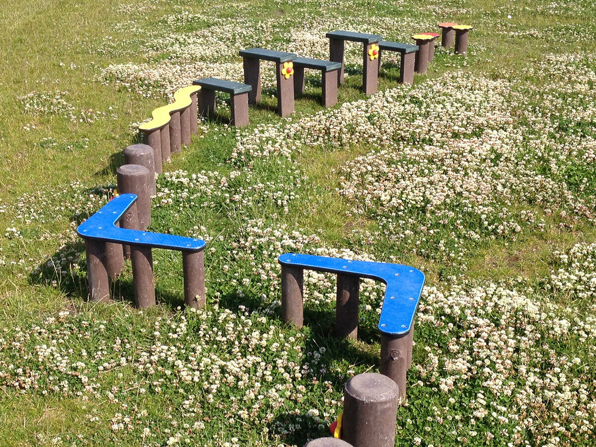 Kleurrijk parcours om in te graven in gras of bosgrond. Het kan eenvoudig verankerd worden met gestabiliseerd zand of lichte beton.
