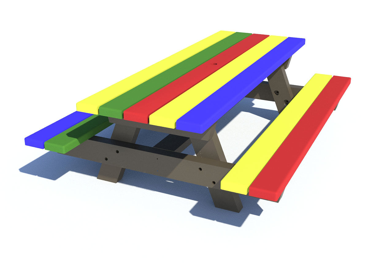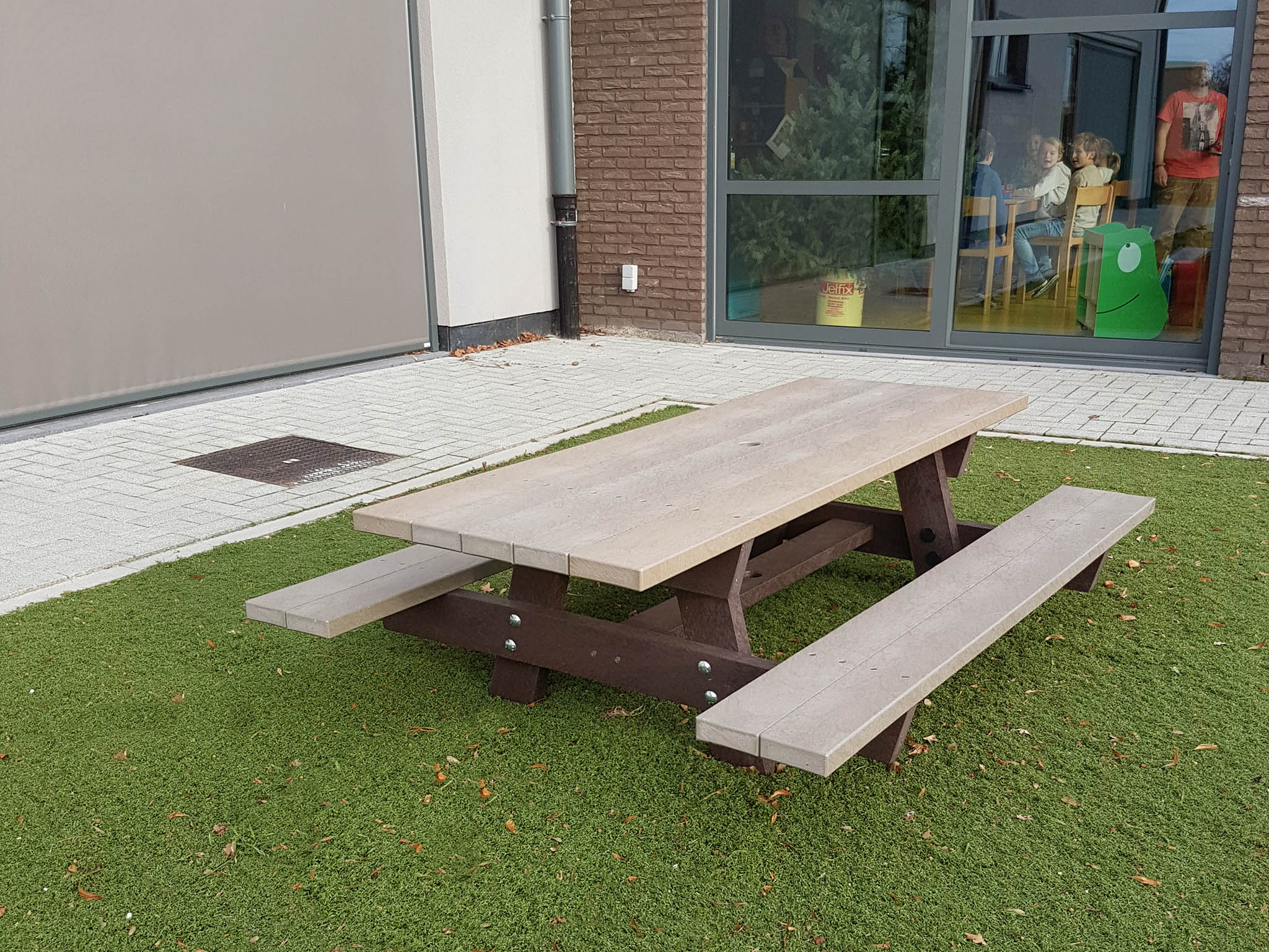 Lange versie van de picknicktafel GP16 voor kleuterscholen en de kleinsten van de lagere school uit gerecycleerd kunststof. Zitvlak 25 cm breed. Voorzien van parasolgat.