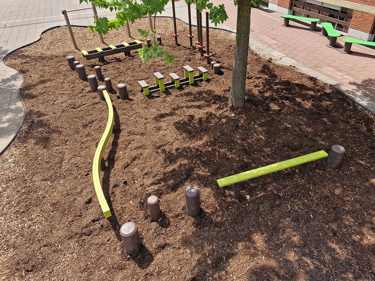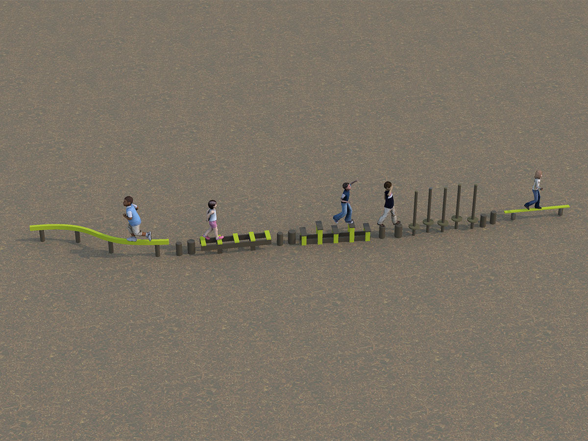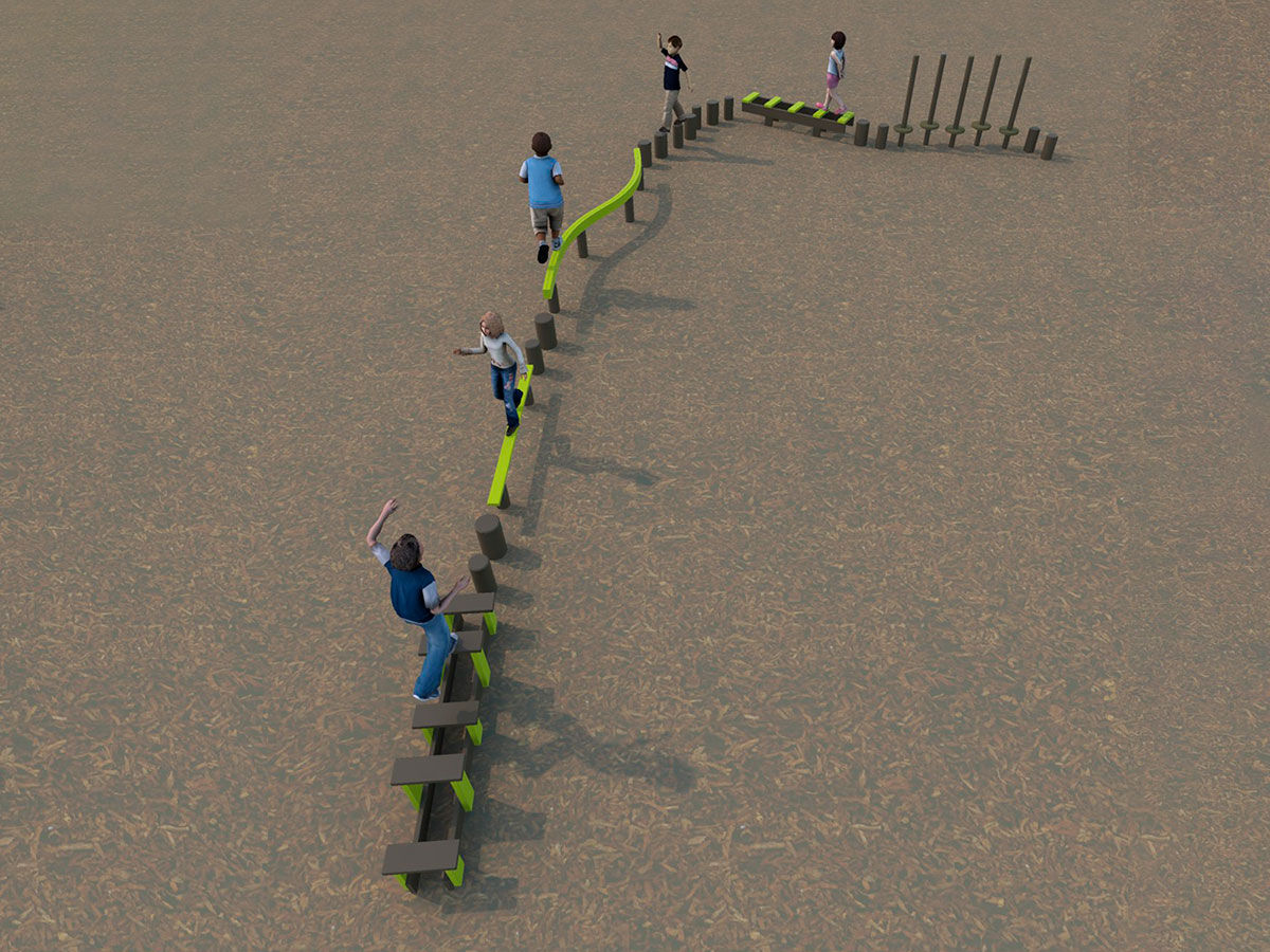 Hindernissenparcours gemaakt uit onderhoudsvrije recycling kunststof om in te graven in gras- of bosgrond. De planken zijn gemaakt uit de gerecycleerde Bebat-vaten waarin vroeger batterijen werden ingezameld, in combinatie met natuurlijke kleuren. Het hele parcours is gemaakt uit onderhoudsvrije recycling kunststof.