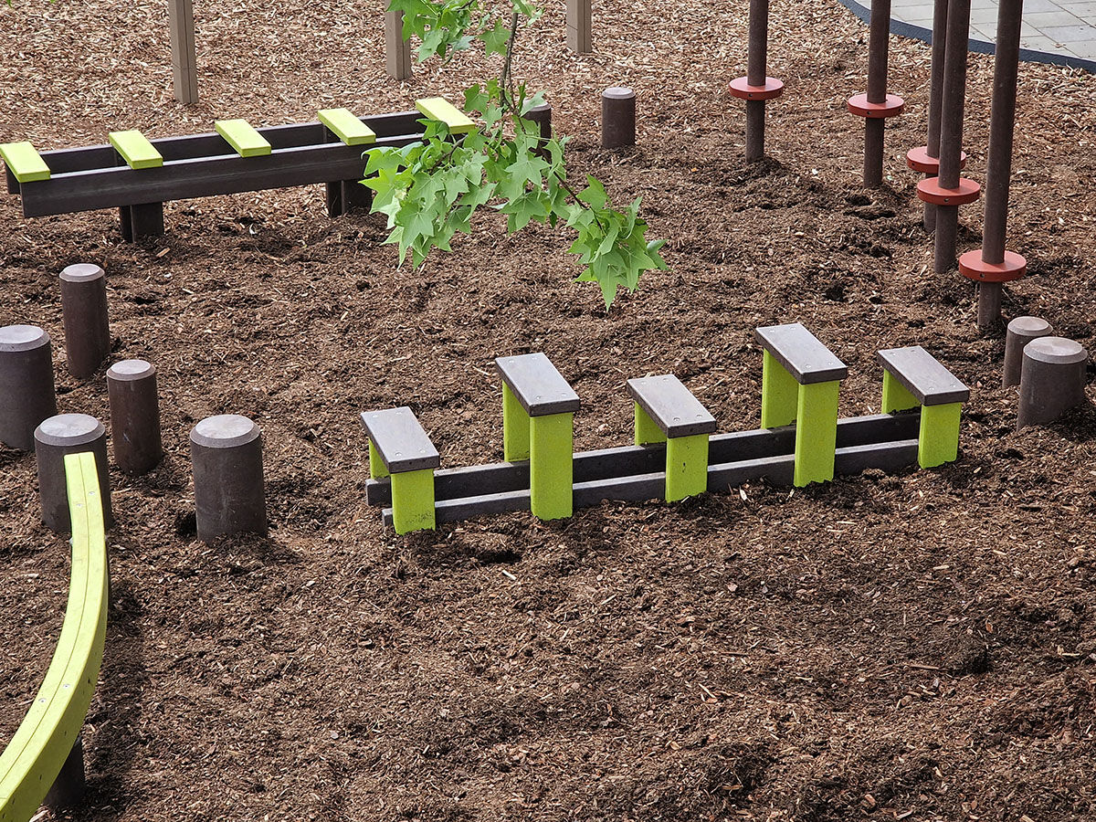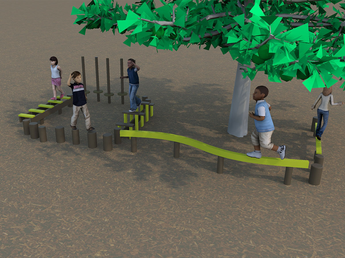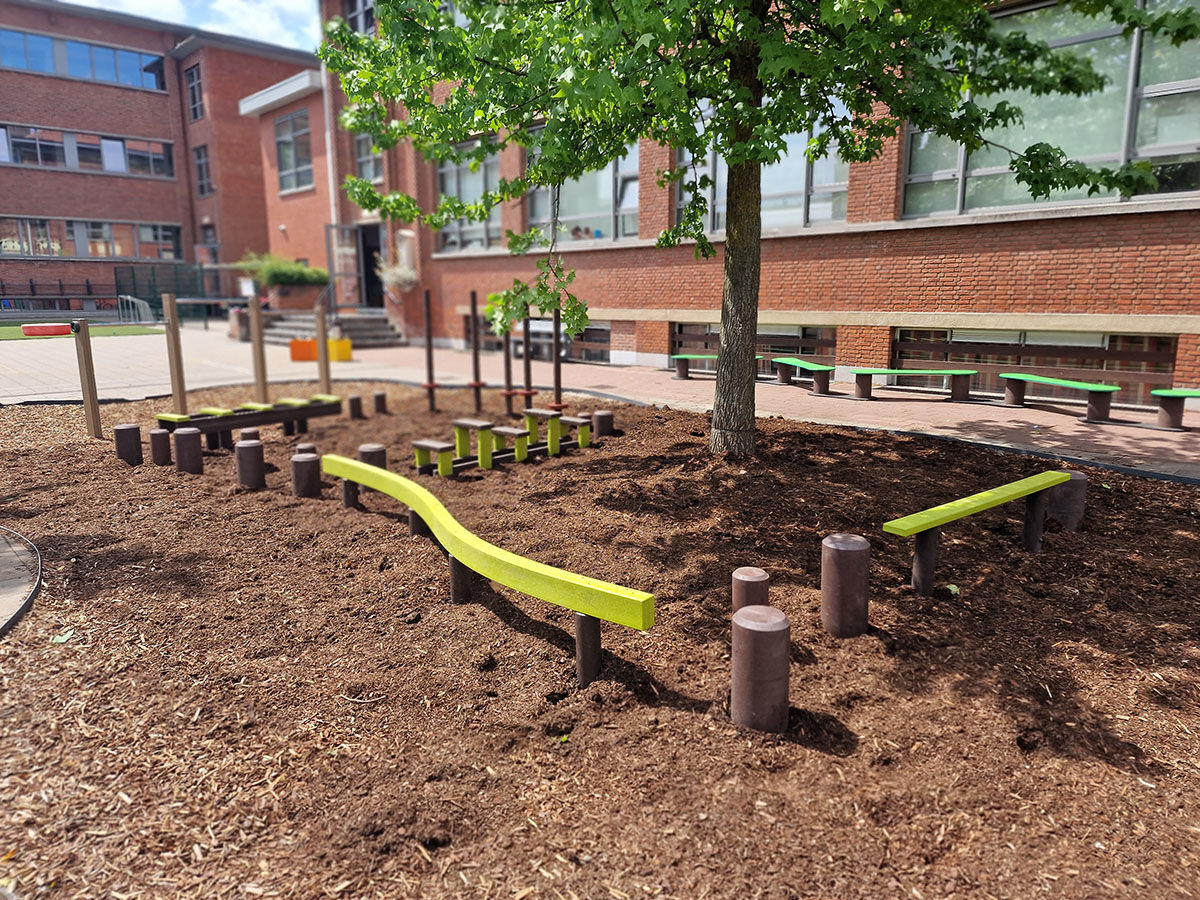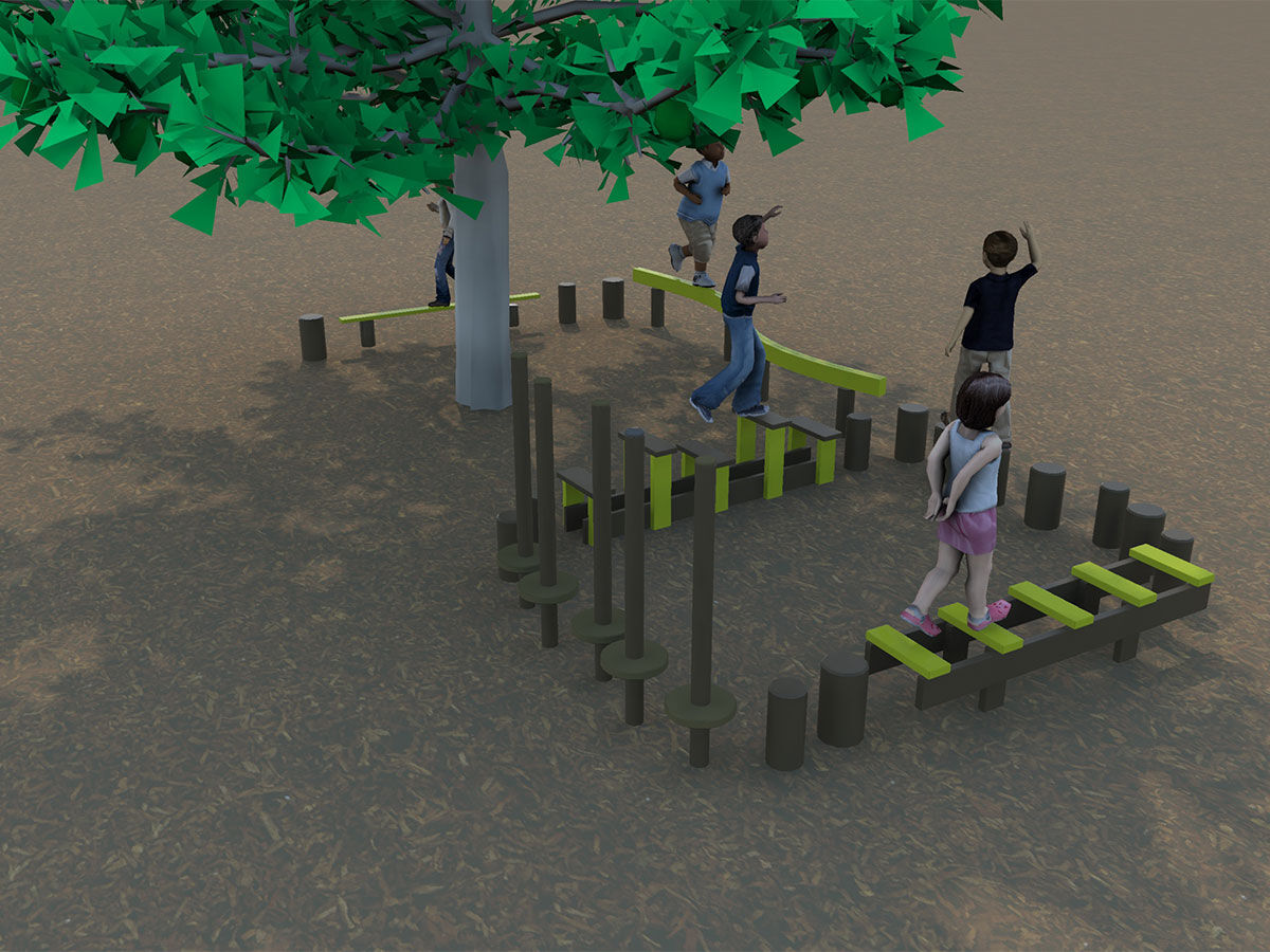 Hindernissenparcours gemaakt uit onderhoudsvrije recycling kunststof om in te graven in gras- of bosgrond. De planken zijn gemaakt uit de gerecycleerde Bebat-vaten waarin vroeger batterijen werden ingezameld, in combinatie met natuurlijke kleuren. Het hele parcours is gemaakt uit onderhoudsvrije recycling kunststof.