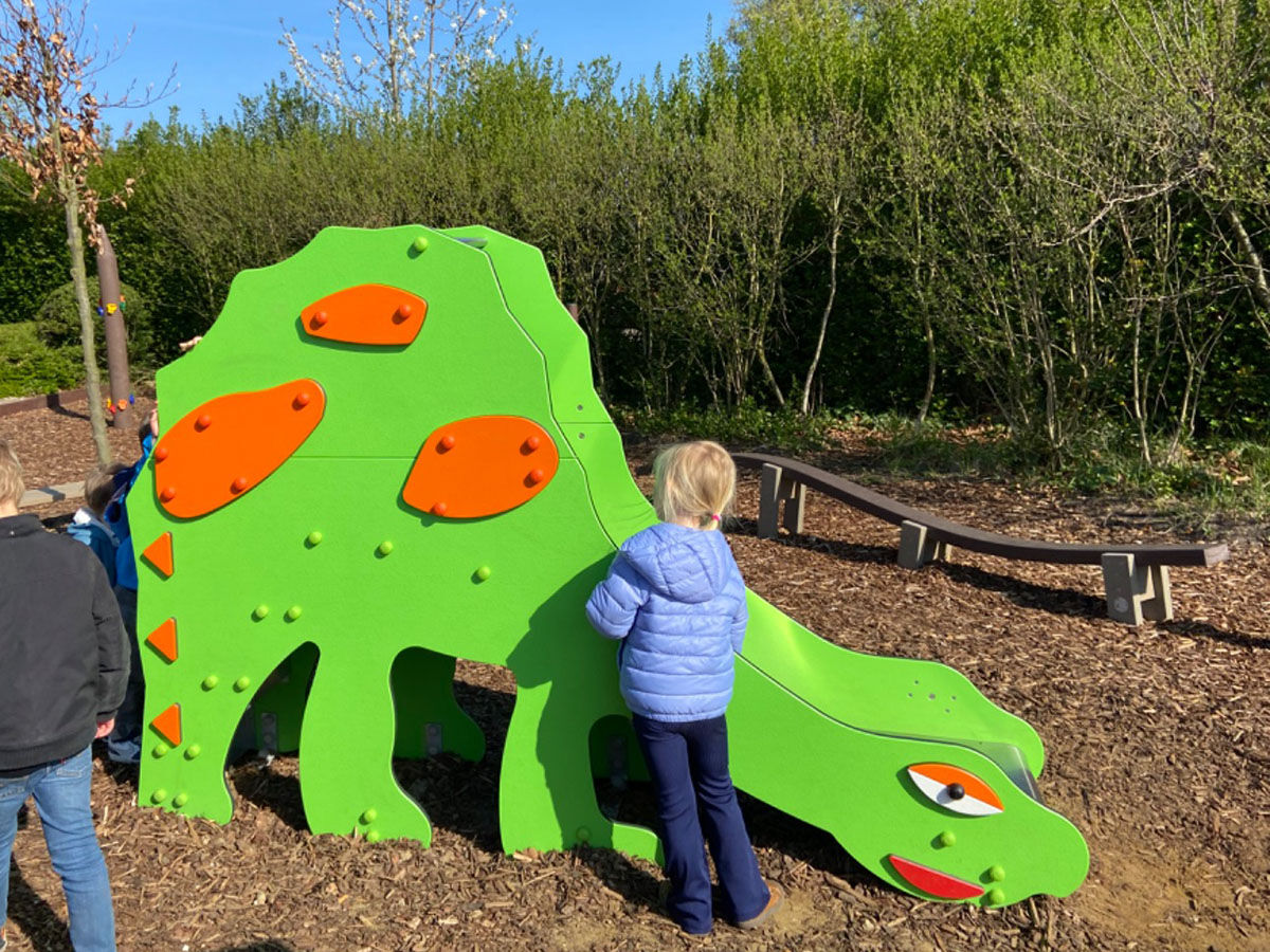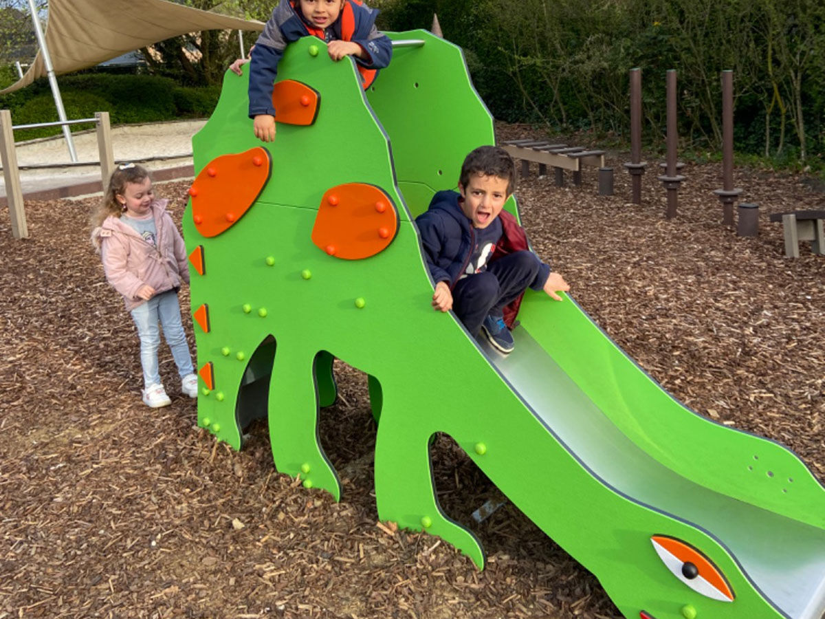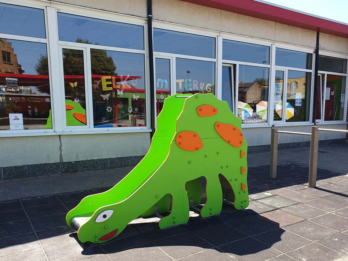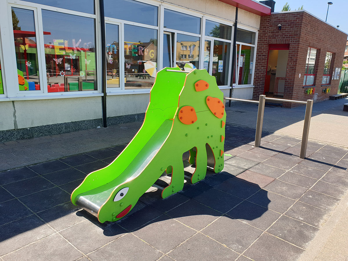 Opgebouwd uit veilig onderhoudsvrij materiaal: RVS glijvlak gecombineerd met UV-bestendige PE-platen.